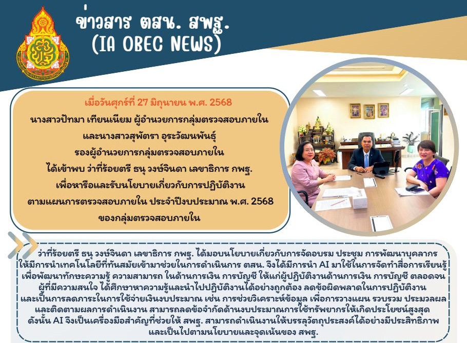 >> 17 กันยายน 2568 แจ้งการจัดทำแผนการตรวจสอบภายใน ประจำปีงบประมาณ พ.ศ. 2569 ของ ตสน.สพฐ. ดังแนบ